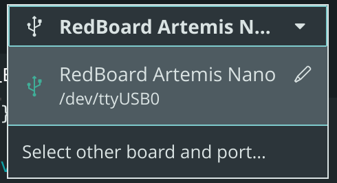 The Artemis board was connected to the computer via USB-C, and the Redboard Artemis Nano board and corresponding port were selected.