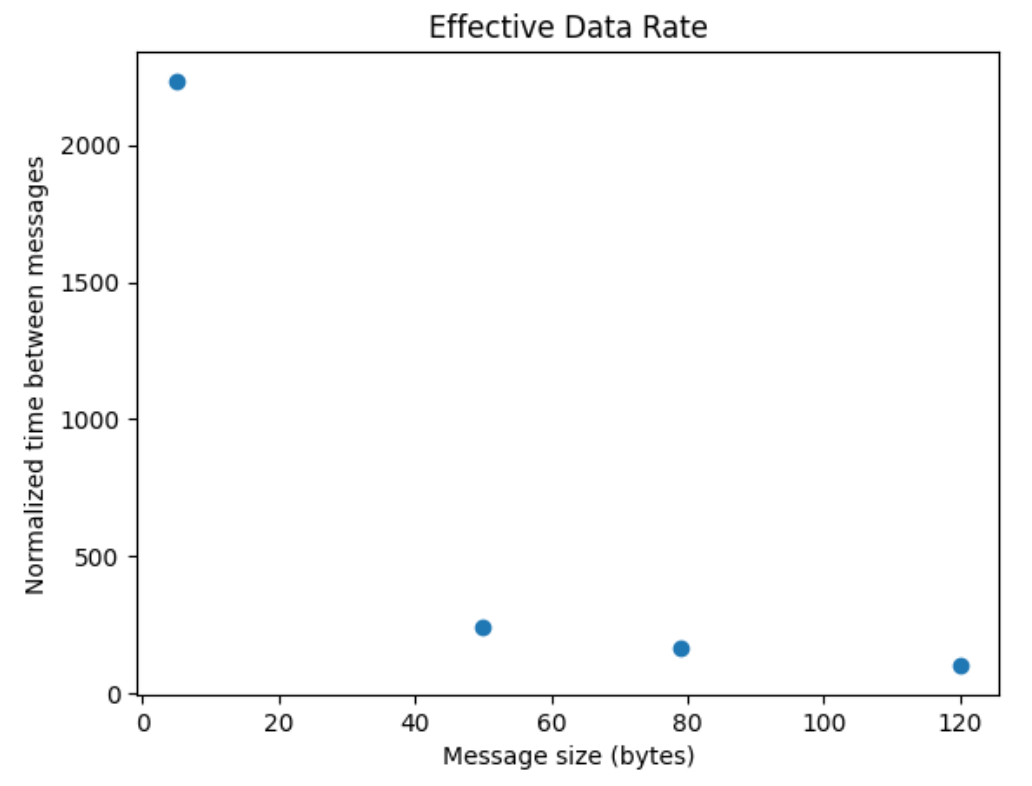 The differences between two consecutive commands were calculated normalized to match the 120 byte size (ex. the 5-byte message rate was multiplied by 24) and the plotted results are shown below. We can conclude that sending one large message is more efficient than many small messages.