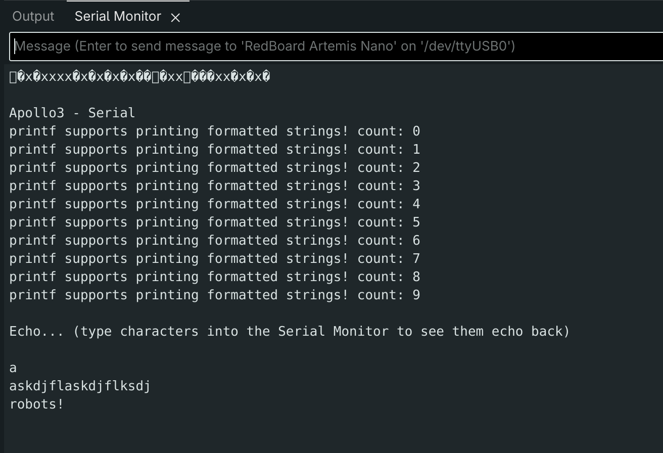 The Example4_Serial code was compiled and uploaded. The serial monitor's baud rate was set to 115000 to match the rate defined in the code. The example code serial writes 0-9 to demonstrate the support of printf. Additionally, the line: