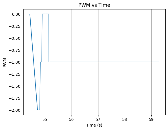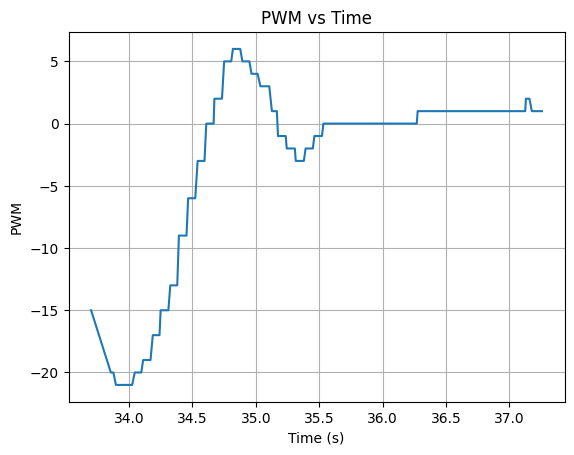 The effects of overshoot are much more apparent as the integral term is no longer constrained. This is further shown in the PWM graph (which actually displays the PID control output u) with much higher values. Therefore, windup is necessary to prevent the car from spiraling out of control and spinning indefinitely with large overshoots.