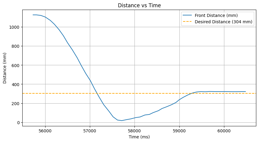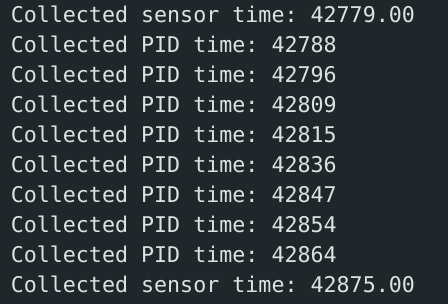 We observe that the gyroscope's sampling rate is around every ~65 ms, or ~15 hz. This is not ideal, as the angular PID control may be using old gyroscope data. For comparison, the linear PID control runs at ~100 hz as found in the Prelab.