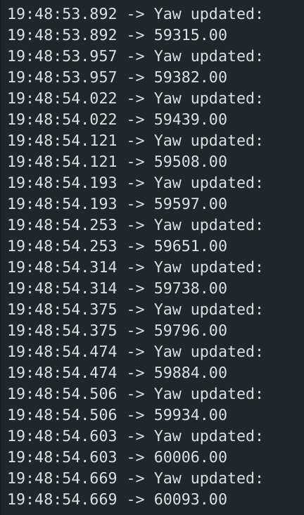 The real-time output of the yaw angle is shown below and appears to be extremely accurate and quick to update: