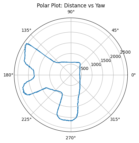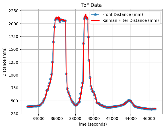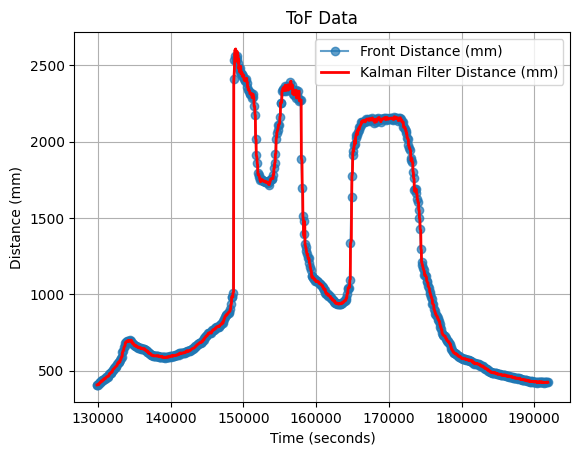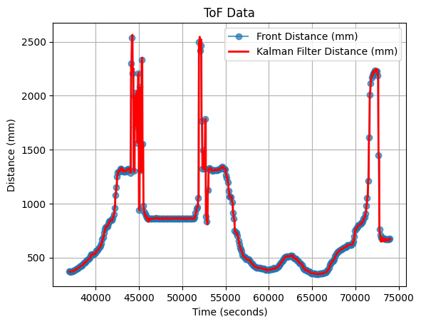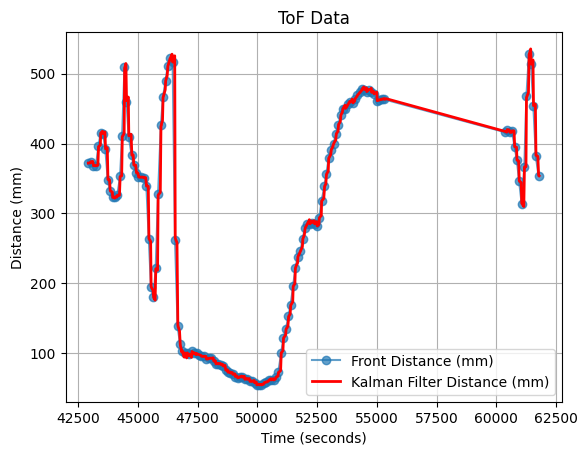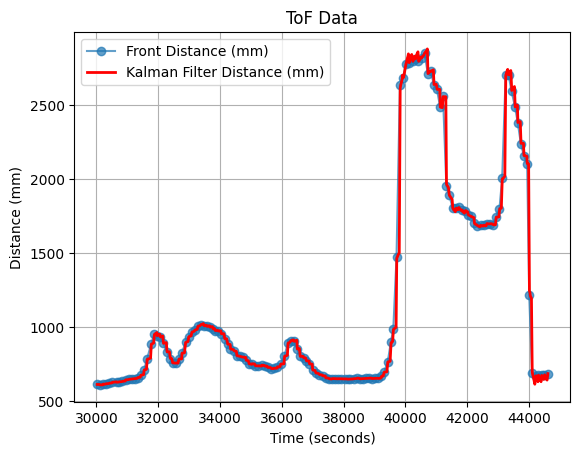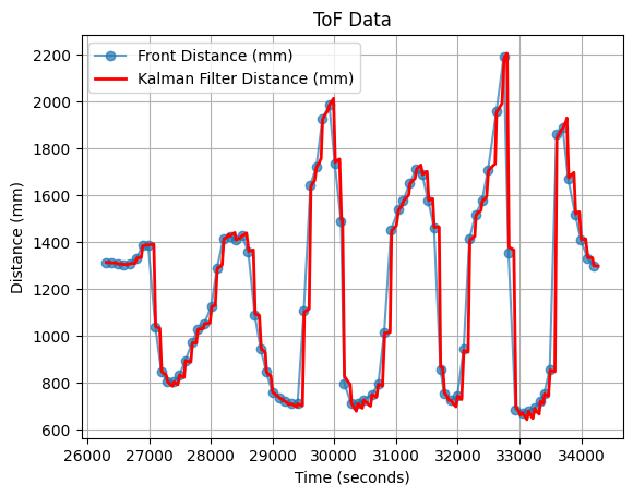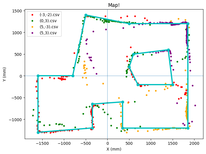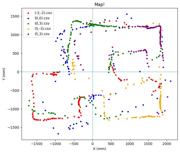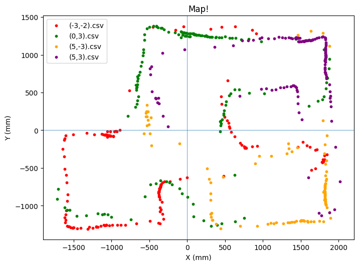 In Python, I imported the logged CSV files, matched the yaw angles with the closest time-aligned ToF/Kalman Filter data, and converted the polar data into the inertial reference frame. The marked locations are in feet, which I converted into mm. I also estimated the distance between the front ToF sensor and the center axis of the car to be ~75mm, which I subtracted from the IMU values.