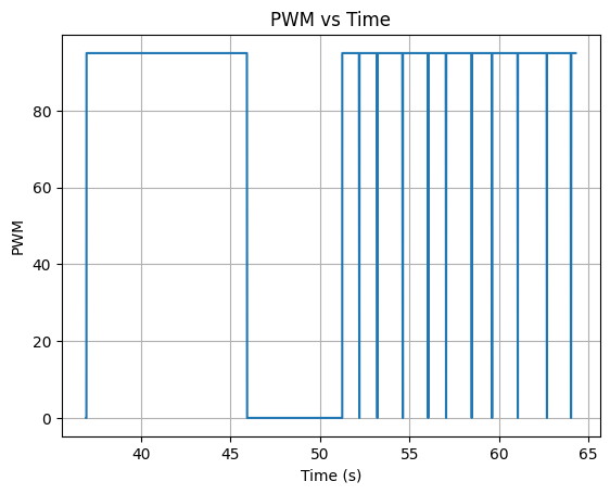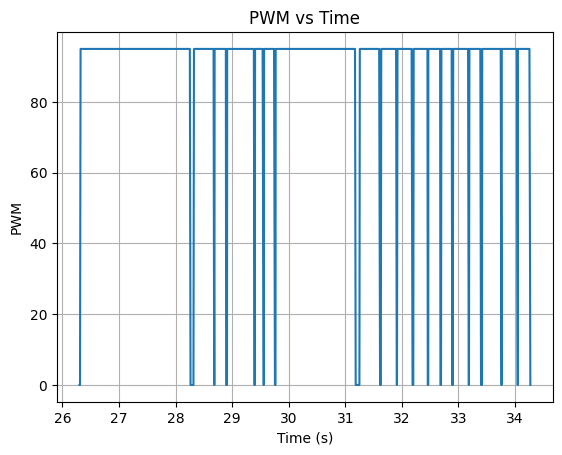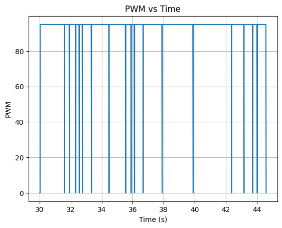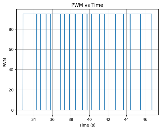 Note that the PWM values alternate between the minimum value to overcome friction, 95, and 0. I experimented with changing the gain values further to have varied values above 95, but found that the car was likely to spin out of control. I decided it was best to keep close to the minimum PWM values.
